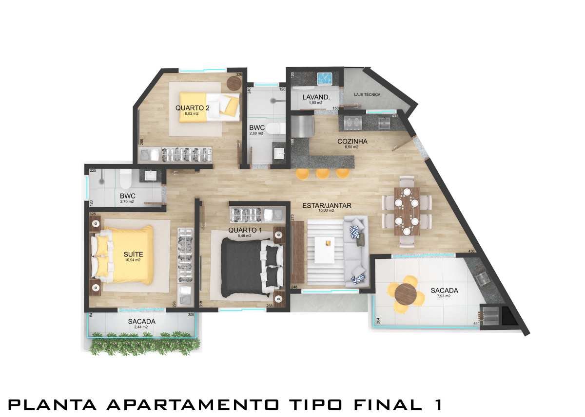 Com apenas 03 apartamentos por pavimento, o projeto garante mais tranquilidade e privacidade aos moradores. Suas plantas integram sala de estar, jantar e sacada com churrasqueira, criando um espaço perfeito para momentos de confraternização em família ou entre amigos.
